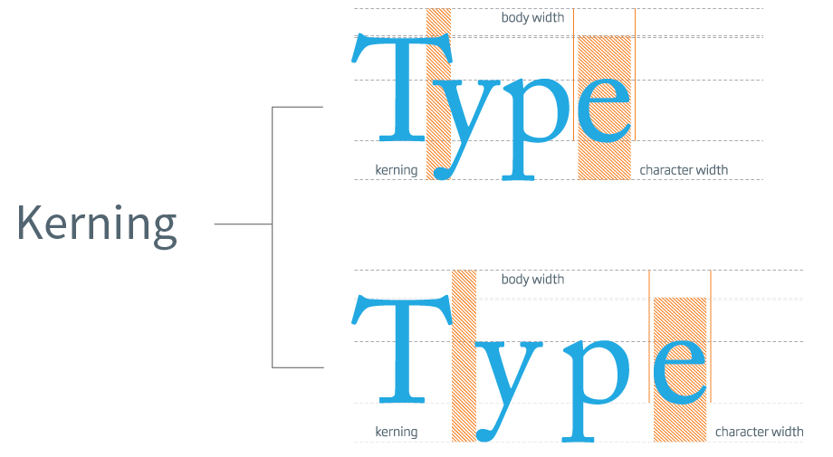 Kerning – refers to the spacing between pairs of letters in the same word. Not all letters are created equal, so certain pairs of letters can appear to form an entirely different letter. For example, the word “learn” can appear to look like “leam” without kerning. With kerning, the designer can create an equal amount of space between letters for more easily readable text.